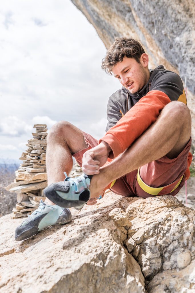French climber Tanguy Merard boots up with the Tenaya Indalo climbing shoes for Biographie (9a+), Céüse, France. Photo: Ben Semiond.