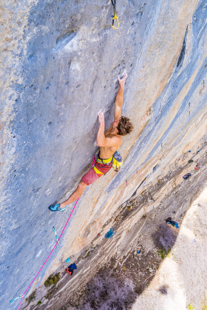 Nineteen year old Tanguy Merard on Biographie (9a+), Céüse, France. He sent the benchmark climb after approximately 60 days of effort spread across three years. Photo: Ben Semiond.
